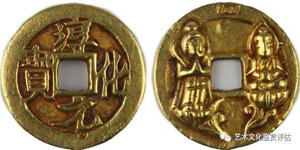 此币正面刻有行书“淳化元宝”四字,字体为宋太宗赵光义御笔亲书,笔法隽永流连,十分洒脱;背面的两尊佛像神态逼真,栩栩如生,右边为手持莲花,正结枷跌坐于八叶莲花宝座之上的观音菩,宝座底下祥云缠绕,左边为头上结发,双手合十,颜貌天真活泼,身体微向右侧站立在莲花瓣座上的善财童子,好一幅“童子拜观音”的画图。