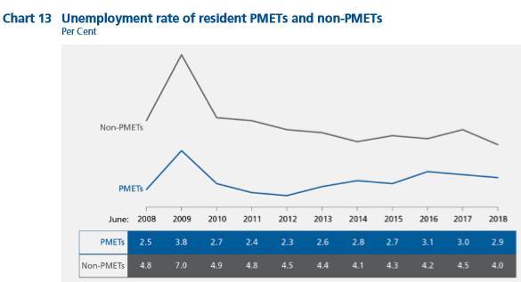 此外,专业人士、经理、执行人员及技师(PMET)的就业情况有所改善,去年6月至今年6月的失业率,未经季度调整是连续第二年下跌,达2.9%,小于去年同期的3.0%。非PMET居民员工失业率则从4.5%下跌至4.0%。