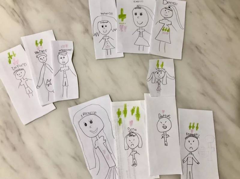 不一会儿,小云云就把全班十个同学都画完并标上名字了。我帮她把每个同学剪下来,变成了11个小纸片人。