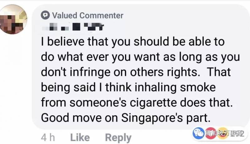 “只要你不侵犯别人的权利,你可以做你想做的事。吸烟者吞云吐雾的过程就是一个侵犯他人权利的行为。所以我希望新加坡能坚持这样的条例。”