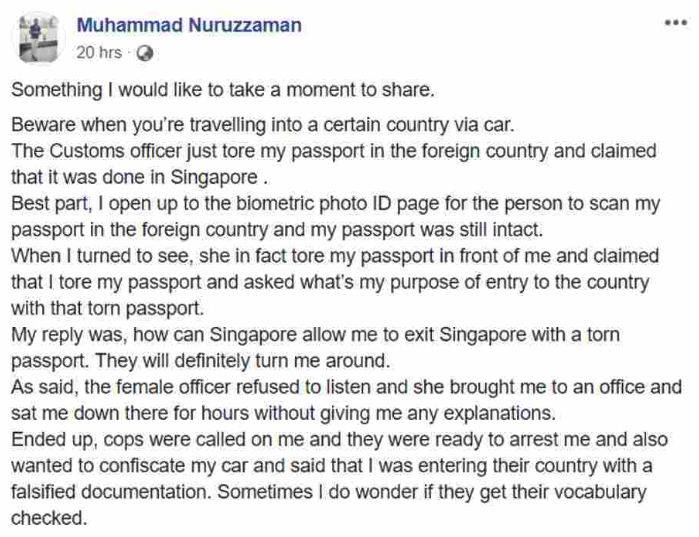Nuruzzaman表示,自己在顺利过完新加坡海关后,却被另一边某个国家的一名女海关官员拦下。他打开自己的护照详情页(含生物识别ID和照片信息)进行扫描。然而,海关官员却将自己的护照撕破,还质问他为什么试图用破损的护照进入该国。