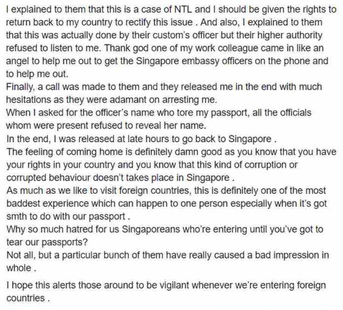 网友一再指出,如果护照一开始就是破损的,自己在新加坡海关那里就不可能被允许出境。但海关官员并不听自己的解释,随后自己便被带进办公室,并关押了好几个小时。