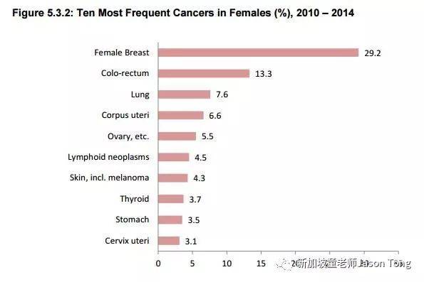 (2010-2014年新加坡十大女性癌症排名,头五名依次为乳癌,结直肠癌,肺癌,子宫癌和卵巢癌)