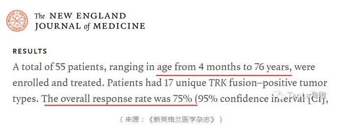 广告时隔半年,2018年2月新英格兰医学杂志(NEJM)在线发表了Vitrakvi同时进行的三项安全性和有效性研究结果,研究显示对于年龄为4个月至76岁的患者,针对17种不同癌症治疗总体反应率为75%。这三项研究包括成人I期研究,儿童I-II期研究,以及青少年和成人II期研究。结果显示,无论患者的年龄或肿瘤类型如何,Vitrakvi对TRK融合阳性的癌症患者均具有明显且持久的抗肿瘤活性。