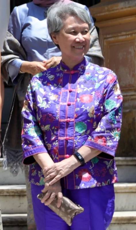 新加坡总理夫人何晶“招牌式”的紫色长裤套装配平底鞋也十分抢眼,它体现了夫人一如既往的独特穿衣品味。但和往常一样,这独特品味不是每个人都欣赏。有网民说,十分“Grandmotherly”(奶奶相),略显老土,也有人以为是忘了换衣就出门。