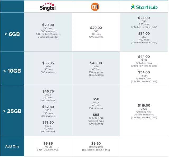 6GB和8GB: StarHub – 6GB的话, 这个 $24/月的有200分钟通话, 周末无限流量. 他家的8GB价格是$34/月