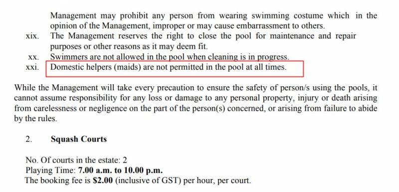 根据上述两栋公寓的“家规”(house rules)及附属细则(By-laws),女佣不得使用公寓的休闲设施。媒体记者在(12月2日)实际走访两栋公寓,32岁的菲佣安透露,家中有小孩会上游泳课或到泳池玩,若她也要进入泳池的话,雇主需要致电管理层,知会他们一声,不过她通常不会那么做。禺滨园公寓的管理层没上班,保安员则不愿置评,叫记者向管理层查询。根据上述两栋公寓的“家规”(house rules)及附属细则(By-laws),女佣不得使用公寓的休闲设施。媒体记者在(12月2日)实际走访两栋公寓,32岁的菲佣安透露,家中有小孩会上游泳课或到泳池玩,若她也要进入泳池的话,雇主需要致电管理层,知会他们一声,不过她通常不会那么做。禺滨园公寓的管理层没上班,保安员则不愿置评,叫记者向管理层查询。