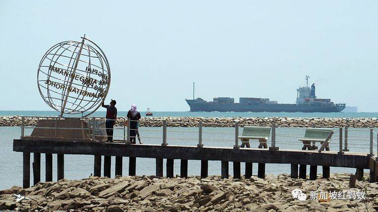 游人站在柔佛最南端看着一艘货船进入新加坡海峡。(路透社)