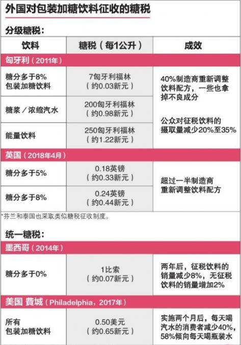这些国家征收糖税的做法也不太一样,有些是一刀切,例如文莱对所有糖分超过6%的碳酸或非碳酸饮料、糖分超过7%的豆奶,还有糖分超过8%的麦芽糖饮料征收每升0.4元糖税。有的国家如英国和泰国则分级征收糖税,较低糖的饮料糖税较低。