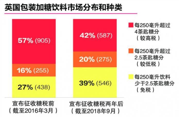 英国2018年4月起,对包装加糖饮料征税前,市面上的高糖饮料有905种,但到了今年9月,随着过半的制造商调整配方,高糖饮料只剩下587种。而少糖饮料进入市场后,销售量每个月平均增加9%。