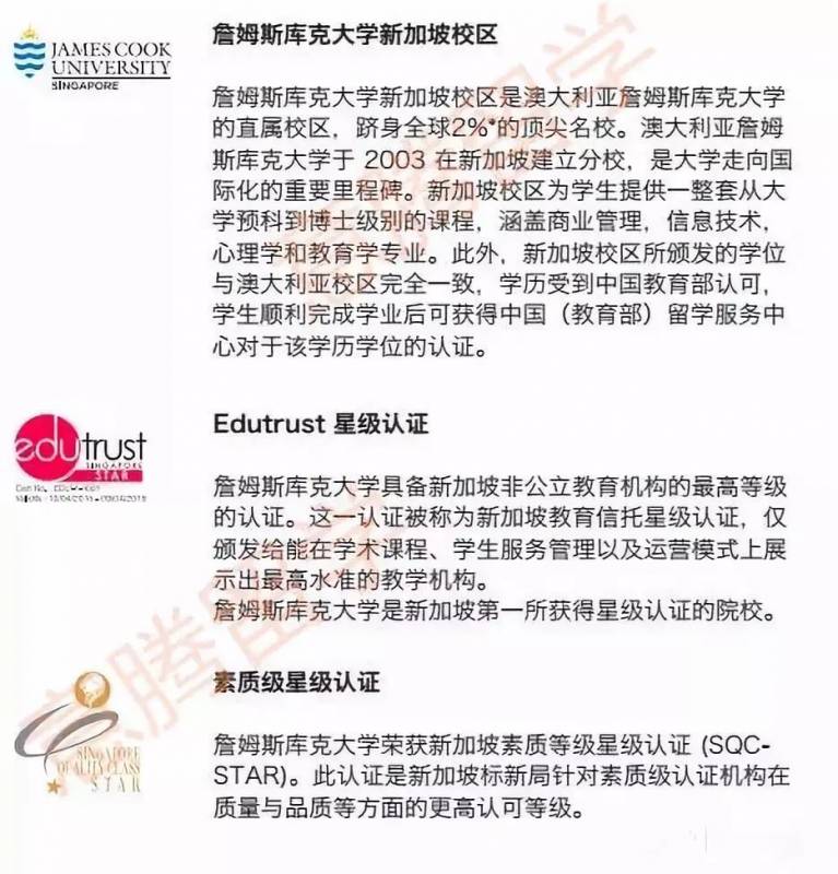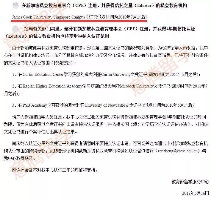 广告由教育部留学服务中心发布的《关于新加坡私立教育机构认证范围的公告》的截图(原公告网址请点击截图图片),其中“James Cook University, Singapore Campus(证书颁发时间为2010年7月之后)”赫然在列!