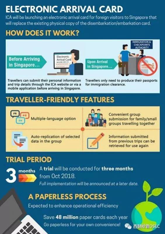 新加坡移民局(ICA)于2018年10月宣布,将试行新的电子入境卡(Electronic Arrival Card),并将逐步替代现有的纸质出入境卡(白卡,Disembarkation/Embarkation Card)。