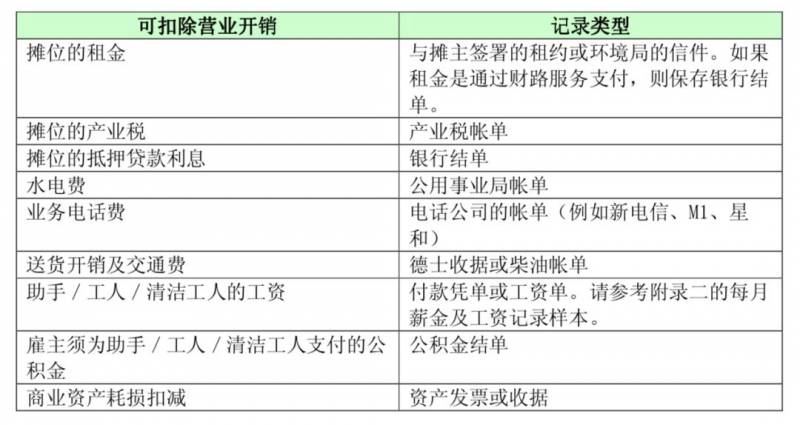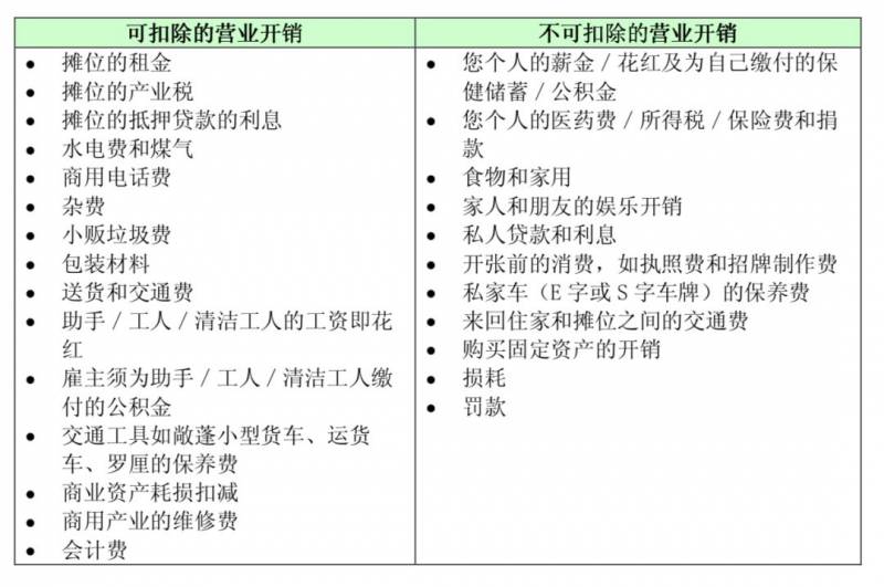 以经营美食摊位来举例,自雇人士经营生意,可扣除的营业开销包括那些完全和纯粹为了赚取利润的真正开销。可扣除和不可扣除 的营业开销之例子如下:
