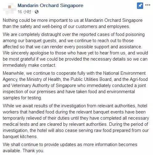 对此,新加坡的文华酒店发Facebook表达了万分的歉意,说道:酒店最为看重的就是客人和员工的安全问题。并表示会及时跟进这次的食物中毒的事件,也愿意对出现问题的客人提供一切帮助。