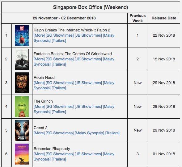 先看上周票房,《无敌破坏王2:大闹互联网》上映2周一直保持在榜首,《神奇动物:格林德沃之罪 》位居第二,新上映的《罗宾汉》、《绿毛怪格林奇》、《奎迪2》依次名列第三、四和五,《波西米亚狂想曲》上映4周,滑落两位,盘踞第六。