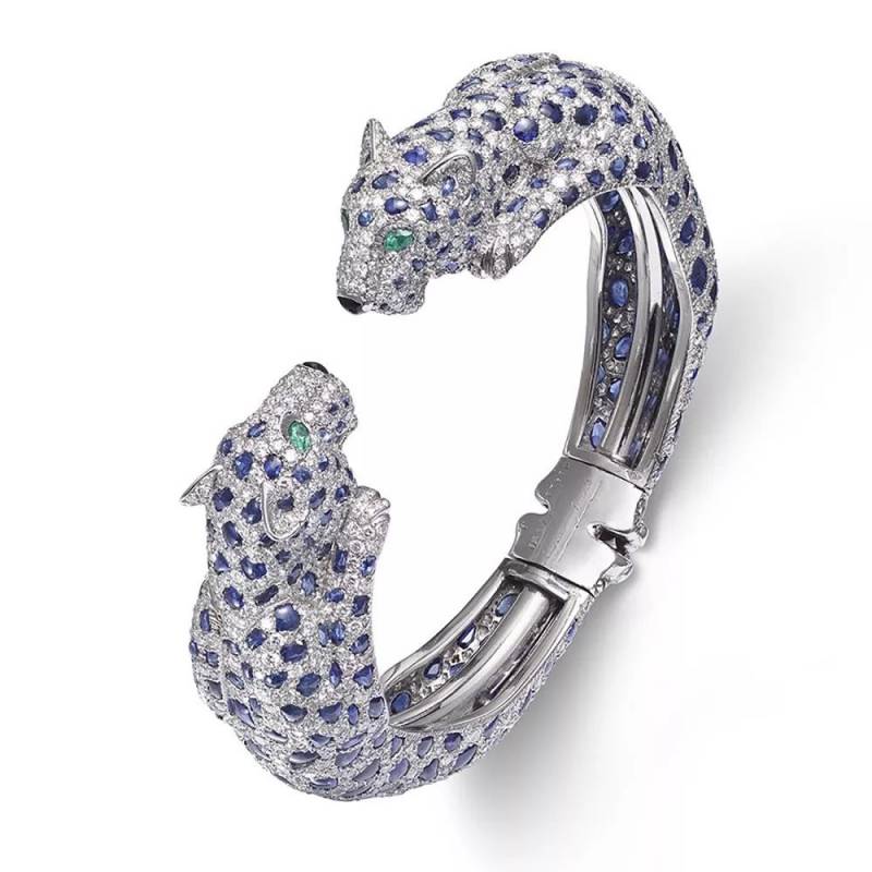 猎豹身体部分镶嵌钻石、蓝宝石,眼睛为榄尖形切割祖母绿,曾属于斯里兰卡模特 Nina Dyer。