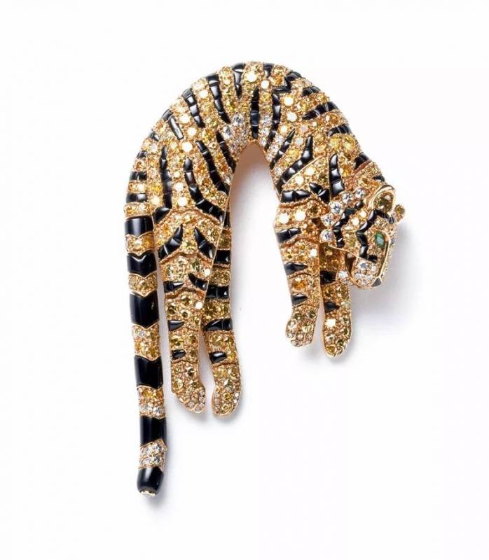 由 Barbara Hutton 定制,表面的花纹以金丝雀黄钻和条纹状排列的缟玛瑙呈现,眼睛部分镶嵌祖母绿,老虎的四肢和尾巴通过铰接的方式进行组合,可以随佩戴者身体的动作自由摆动。