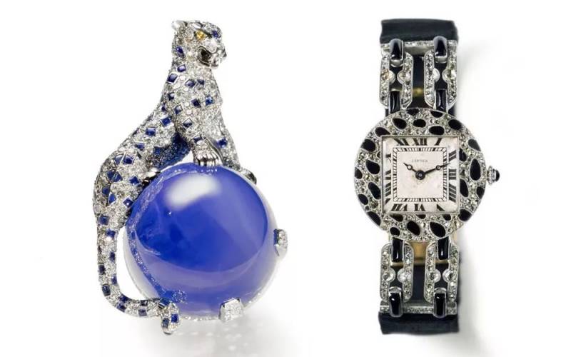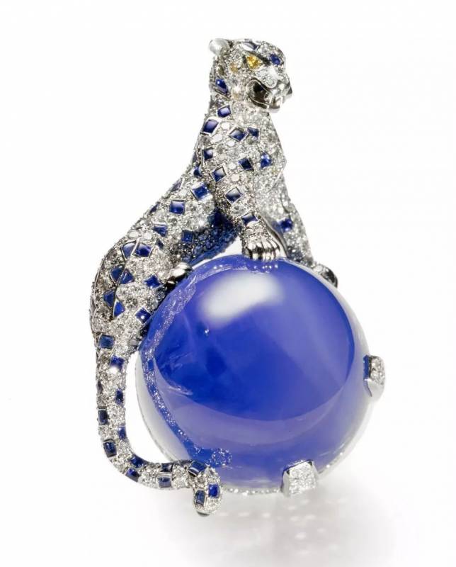 镶有一颗152.35ct克什米尔弧面切割蓝宝石,猎豹造型采用全钻石镶嵌,以蓝宝石点缀出豹纹,眼睛部分镶嵌黄钻,曾属于温莎公爵夫人(Duchess of Windsor)。