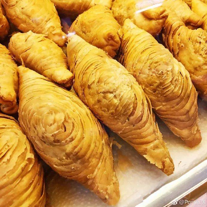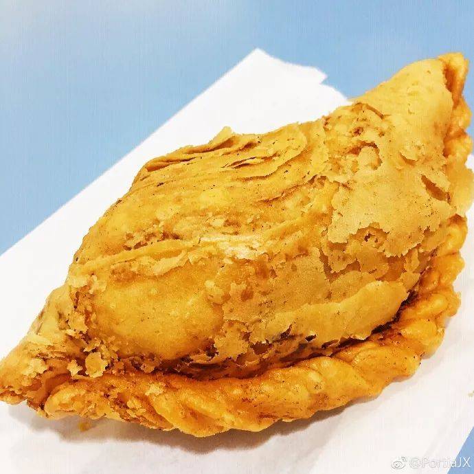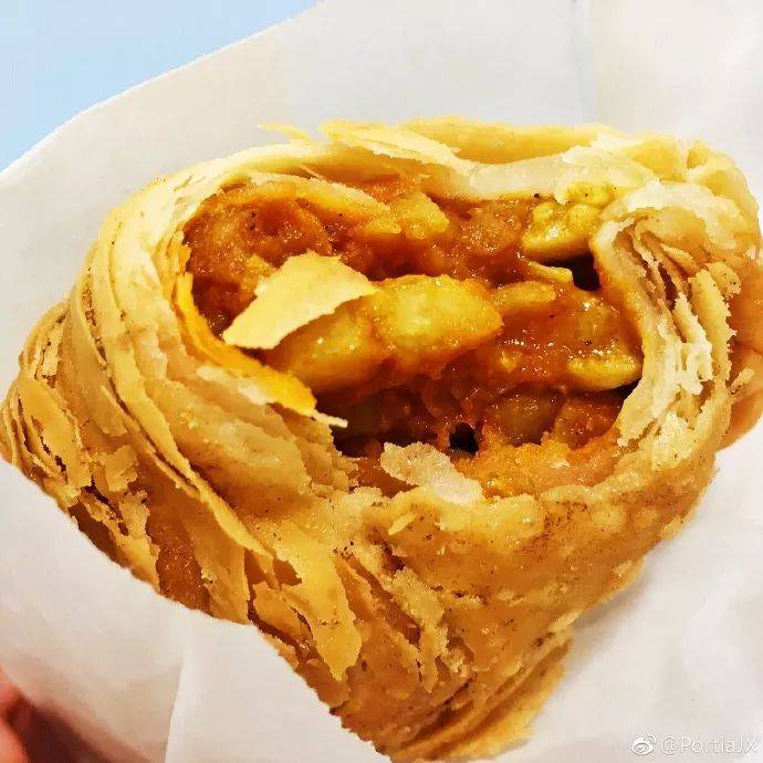 店内售卖三种口味:黑胡椒鸡肉、沙丁鱼和咖喱马铃薯鸡肉。千层酥皮炸得很酥,咬开后发现料很足呢。