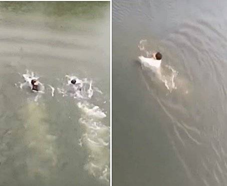 两少年过后在水中比赛游泳。(视频截图)(视频截图)