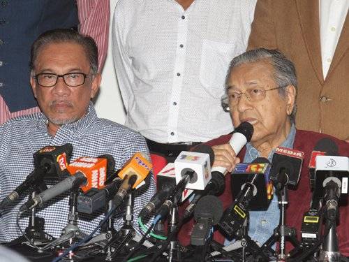 马哈迪在记者会上发言,左为人民公正党主席拿督斯里安华。