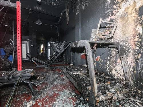除了已经烧成废铁的跑步机,旁边一台卧推哑铃椅也破损不堪,健身房墙壁和天花板也熏黑,地面布满玻璃碎片,现场一片狼藉。