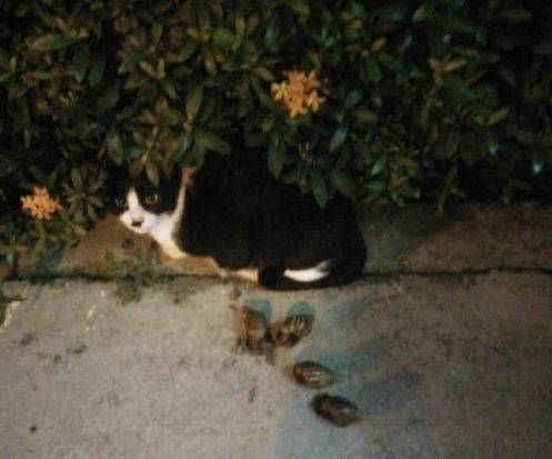我们还在某天早上看到了神奇的一幕.......一只小黑猫的旁边,躺着四只蜗牛!四只!看上去像喵的孩子有没有!