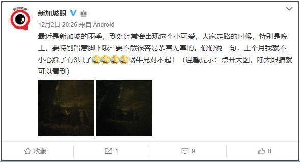 由于现在是新加坡雨季,蜗牛泛滥成灾,老是在路上爬,很容易被人不小心踩到,命丧黄泉!