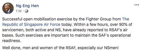 国防部长黄永宏医生脸书发文:此次动员演习中九成以上的受训军人(含现役和战备军人)在数小时内完成了在空军基地的报到,此类演习对维持新加坡武装部队的行动准备度非常重要。