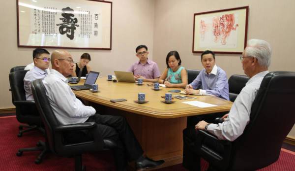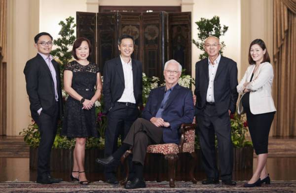 采访团队成员(左起)刘锦华、谢瑞英、执笔者白胜晖、李佩滢以及《海峡时报》特别任务总编辑韩福光(右2),与吴资政合照。