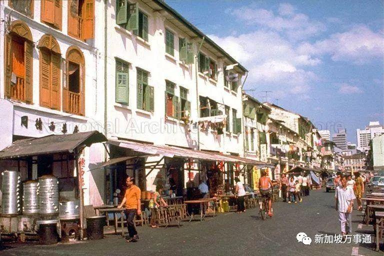 街边的摊贩有序的排在路的两边,中间空出足够的位置供行人和车辆经过。看来新加坡的秩序从上世纪就已经很井然有序了呢。