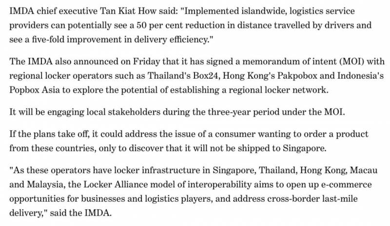 根据新加坡8频道新闻媒体报道,新加坡资讯通信媒体发展局计划在全国推行的共用包裹储物系统“储柜联盟”(Locker Alliance)即日起在两个试点地区启用,公众可透过系统领取在网上订购的物品。