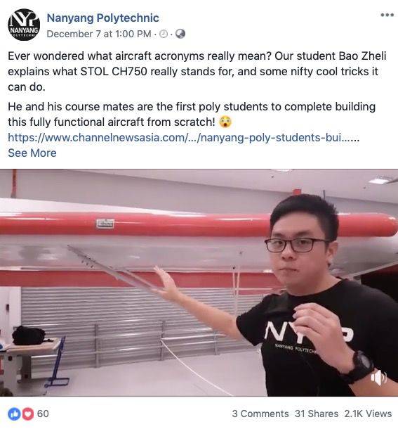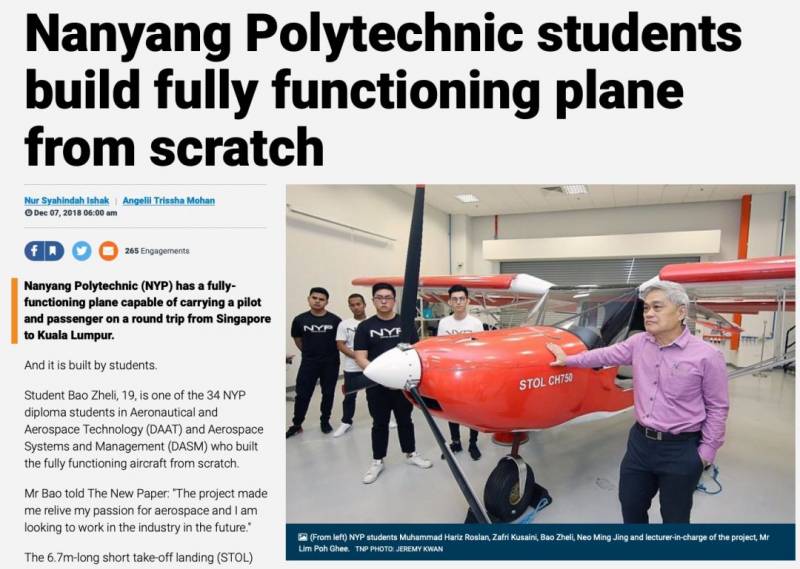这架型号为CH750的短程起降飞机,是南洋理工学院工程系学生的作品,这也是世界各地不少飞机爱好者和专业人士乐于尝试建造的机型。由于市面上针对此型号飞机已有较多资料和经验可循,南洋理工学院工程系高级讲师林宝义于2014年开启了这项专门针对三年级学生的毕业设计项目,让学生从零开始,建造一架功能齐全、可飞上天的飞机。