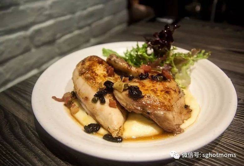 另一道值得一试的菜是完美的招牌半烤春鸡(13.9新币),配上奶油土豆,淋上鸡汁,培根,大蒜和酸柑的酱汁。你一定会为它着迷。