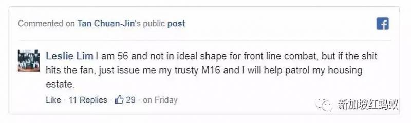 56岁的网民说,虽然我的身体状况已不再适合在前线作战,若事情真的发展得非常糟糕,请给我一把M16步枪,我就负责巡逻自己的组屋区。