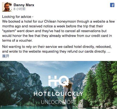 这位网友就在留言中提到,她是在两个月前付了钱,如今不知道该如何向HotelQuickly索取赔偿。而这名原定到智利蜜月旅游的网友同样也在社交媒体上透露,说自己在启程一个星期前接到HotelQuickly的通知,指“公司系统出现故障”,需取消所有订单,并答应以“固本方式”给予赔偿。