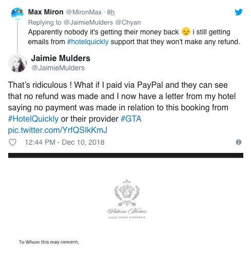 他们不少是数月前在网站上预订酒店房间,但在旅程开始前遭临时取消。这位声称通过PayPal 付了客房费用的网民,上载了一封最近从澳大利亚昆士兰酒店那里发给她的信。酒店在信中写道,没有收到预订客房的付款,她之前通过HotelQuickly预订的酒店客房已被取消。