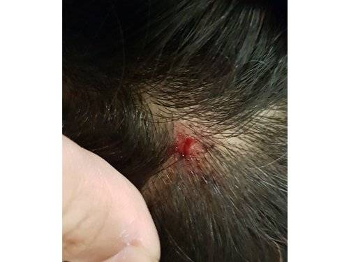 女童被女佣用猫抓板打伤,头破皮流血。