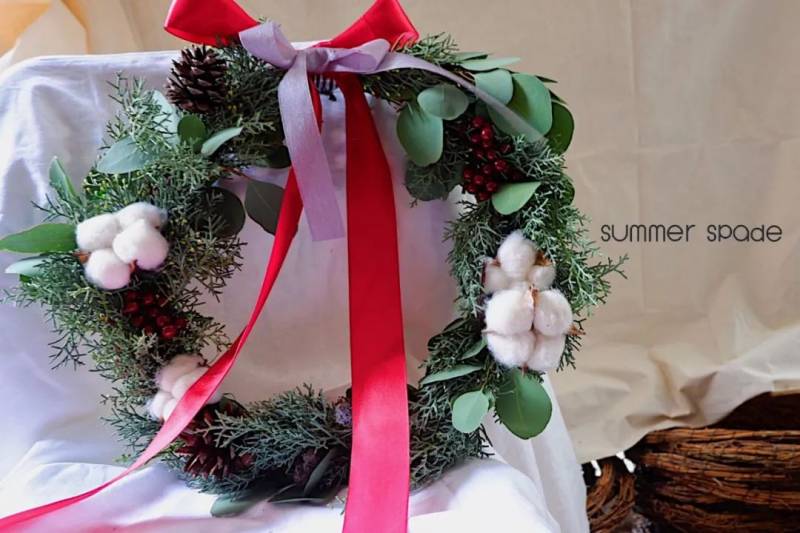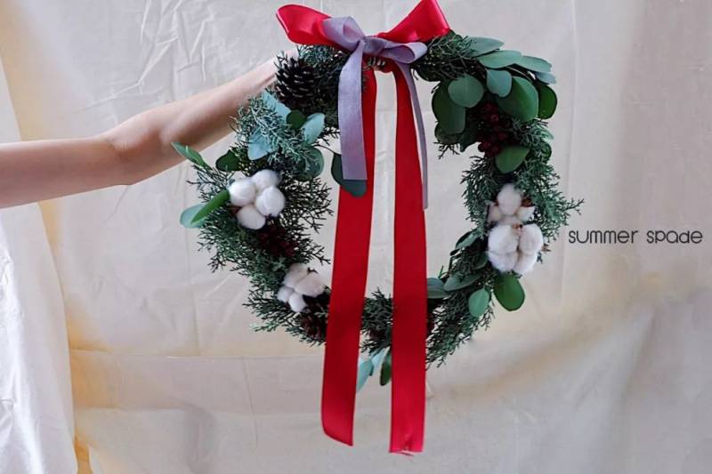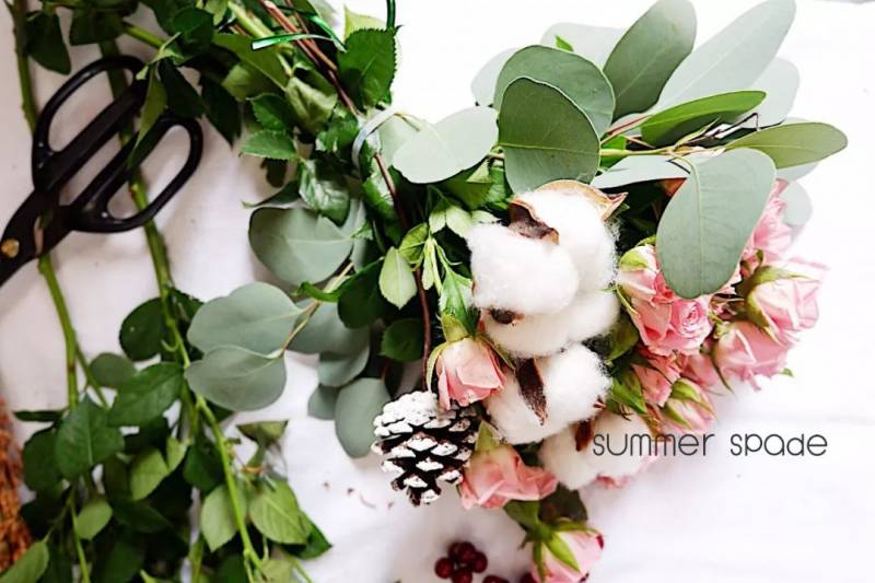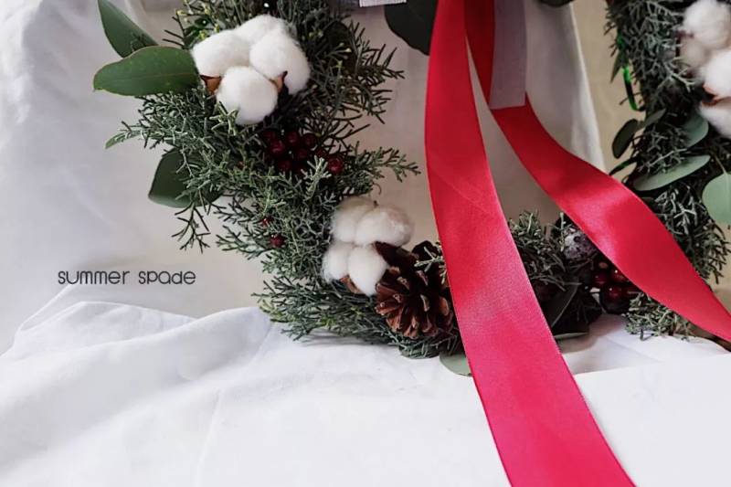 在清香四溢的松枝扎成的环上,棉花,松果,还有浆果星星点点的散落着。枝藤圈圈绕绕,圆滚滚的棉花,厚实得如同冬日的毛毯。温暖治愈。伴你度过一个平安夜。