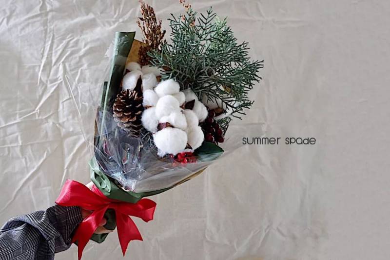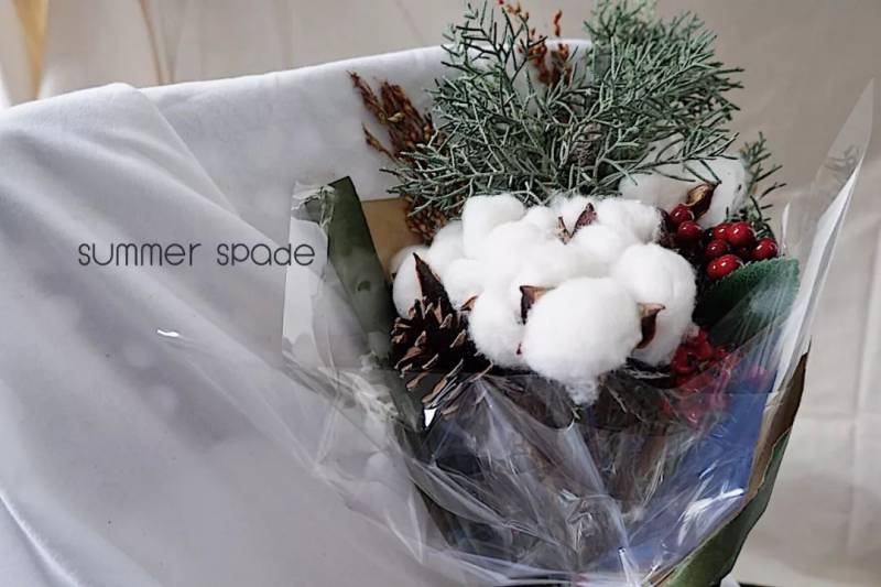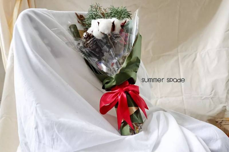 圣诞的音乐响起来,街道上都是满满地圣诞装饰。充满圣诞气息的绿色圣诞也出现在了花束当中,松果,雪白的棉花还有绛红的浆果代替了鲜花,出现在了花束当中。抱着花束穿梭在热闹欢腾的街道当中,回到家,将花束放置在餐座上,年末的温馨,没有冬日的新加坡,也变得有丝冬意。