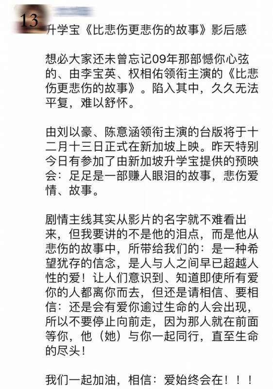 上周日,智选择优姐妹品牌“升学宝”,为新加坡的留学生们组织了一场“包场”观影活动,而且是影片正式上线前的提前批观看。电影名称为《比悲伤更悲伤的故事》,由陈意涵、刘以豪主演,mm2全亚影视娱乐有限公司出品。