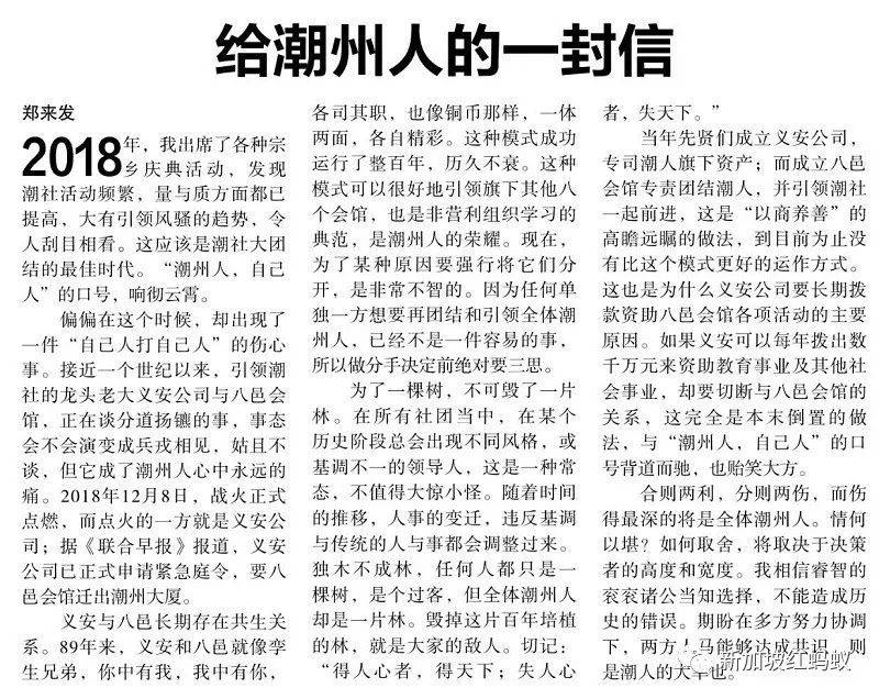无独有偶,今早翻开《联合早报》交流版,也看到《早报》专栏作者郑来发给本地潮州人写了一封信(看来潮州人都很喜欢写信),指潮人如今“自己人打自己人”,战火已正式点燃,而点火的一方正是“弟弟”义安公司,成了“潮州人心中永远的痛。”