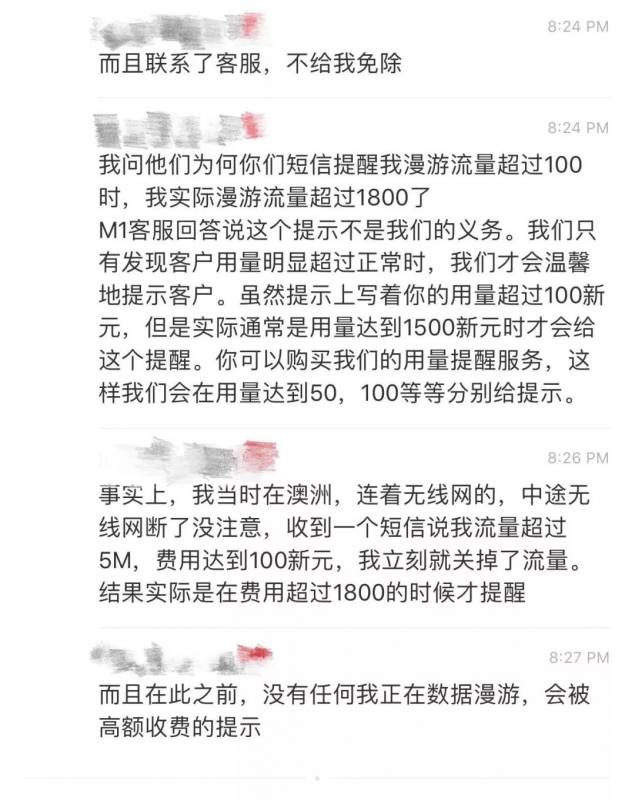 网友联系了M1客服,但是客服表示提醒用户漫游流量不属于M1义务范围之内,M1只会在漫游用量明显有异常时才会温馨提示。如果用户有需要用量提醒服务,是需要单独付费购买的...