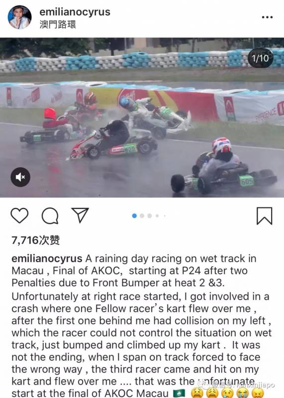 12月9日比赛当天,澳门下着中雨,赛道湿滑,一辆卡丁车失控打滑后撞向了EC一平,导致他的卡丁车滑向跑道中央。后面的车手躲闪不及,连环撞车,EC一平被直接撞出了跑道,场面一度十分混乱。