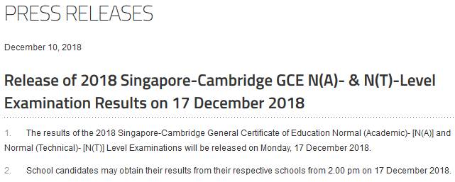 新加坡教育部(MOE)昨天发布公告,2018年N水准考试成绩将于下星期一(17日)放榜,考生可在当天下午2时,回学校领取成绩单。