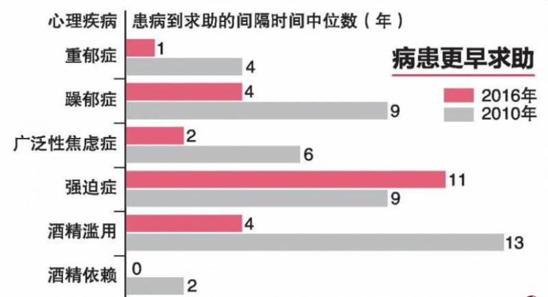 其余五个心理疾病的间隔时间都减少了。例如,躁郁症患者的求医间隔时间从九年减至四年,而酒精滥用的酗酒者更是从13年大幅减至四年。