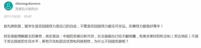 还有有小伙伴在问题下回答,留学生是否回国效力是自己的自由,不管是否回国效力都无可非议。