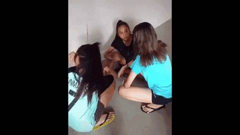 在视频里两名穿着淡蓝色短袖的女生和一个黑衣女生半蹲在地上交谈。结果右边的蓝衣女孩突然甩手打了对面黑衣女孩一巴掌。