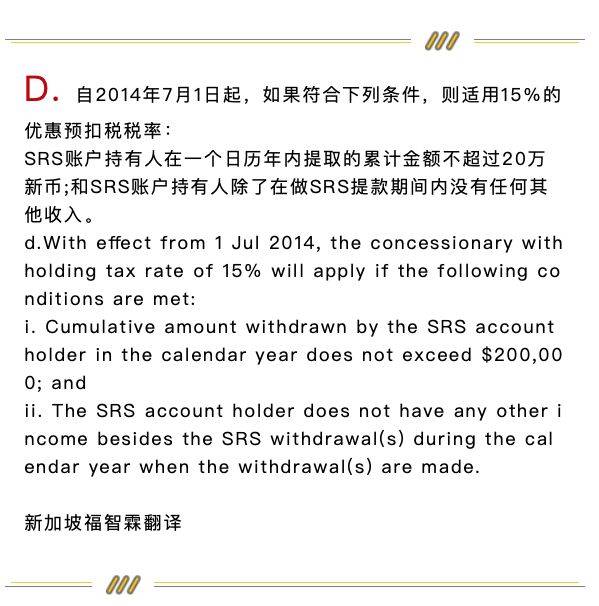 广告新加坡补充退休计划(SRS)是一项自愿计划,旨在鼓励个人为退休储蓄, 在他们的公积金储蓄基础上更多保障。 SRS上的储蓄有资格获得减税。投资回报在提款前是免税的,在退休时只有50%的SRS提款需纳税。