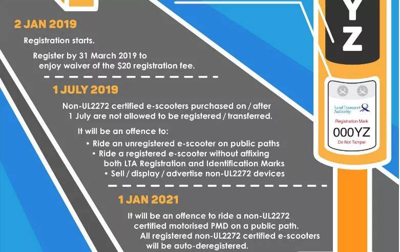 现有使用不符合UL2272标准的电动踏板车车主,可向陆交局注册,但只能使用到2020年12月31日,之后这些器材将自动注销注册。